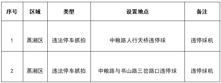 本次启用新增交通技术监控设备公告时间自2025年7月14日至2025年7月18日,公告期为5天,公示结束后2025年7月19日正式启用。请广大交通参与者自觉遵守道路交通安全法律法规,文明行车,共同维护安全、畅通、有序的道路交通环境。特此公告衡阳市公安局交通警察支队2025年7月13日